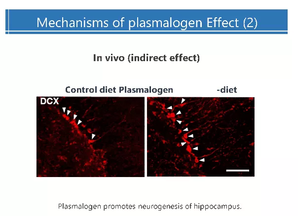 This figure explains plasmalogen enhance the neurogenesis the memory-related hippocampal cells of mice immunostaining data. As shown in the right panel, the Plasmalogen-diet mice showed more positive neurons in the dentate gyrus, compared with normal diet.