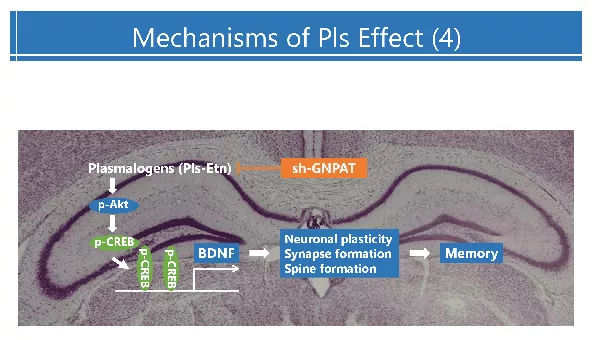 Knock down of plasmalogen synthesizing enzyme (GNPAT) by sh-RNA in the hippocampus reduced plasmalogen and impairs spatial memory. Dietary plasmalogen for 6 weeks increased hippocampal plasmalogen and enhanced memory task performance. Dietary plasmalogen activated Akt and ERK1/2, in the hippocampus, to phosphorylate CREB, then induced expression of brain-derived neurotrophic factor (BDNF), which is well known to enhance memory function by affecting neuronal plasticity and synapse/spine formation. plasmalogen are rich in membrane lipid rafts and dietary plasmalogen result in a localization of BDNF receptor, TrkB in the lipid raft. These findings suggest that plasmalogen may enhance the memory by activating BDNF- TrkB signaling in the hippocampus.