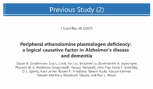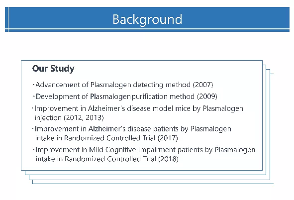 Furthermore, we publis hed research papers in 2012 and 2013 reporting that Pls were effective in rats with Alzheimer’s disease, and in 2012 that the levels of Pls were reduced in the erythrocytes of patients with the disease. We conducted a randomized double – blind placebo – contro lled trial involving humans from Nov. 2014 to Apr. 2016