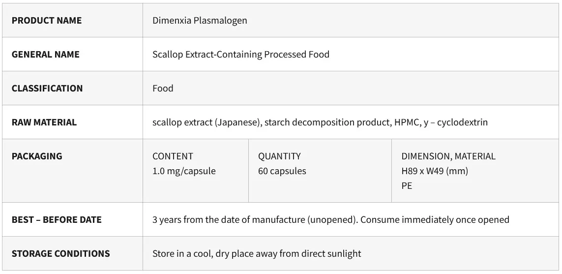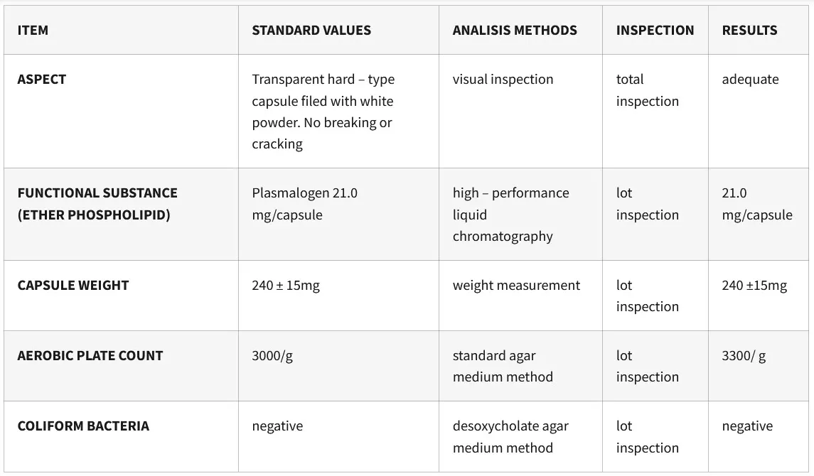 | FUNCTIONAL SUBSTANCE (ETHER PHOSPHOLIPID) | Plasmalogen 21.0 mg/capsule | high – performance liquid chromatography | lot inspection | 21.0 mg/capsule | |